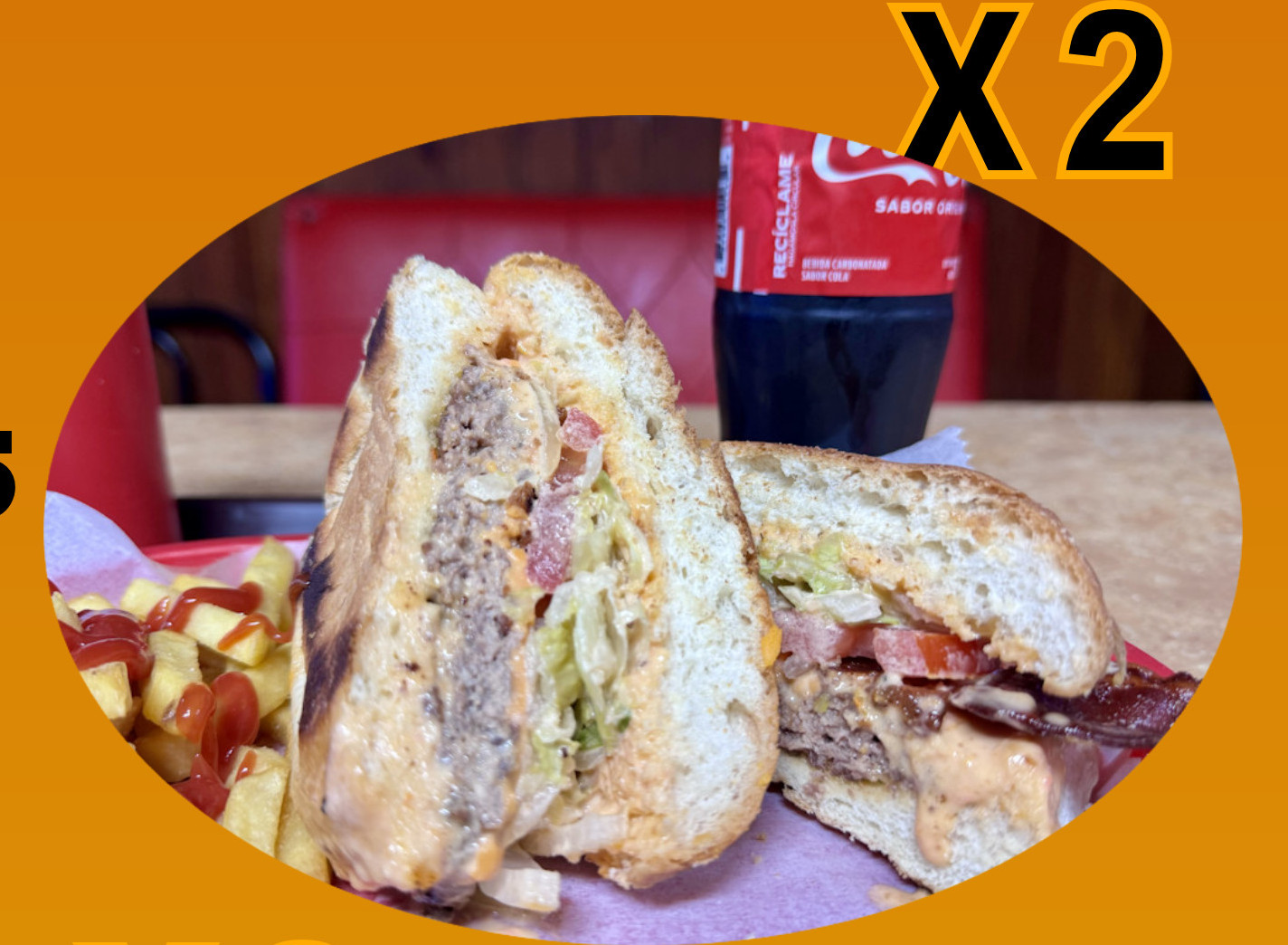 2 Combos Grandes 100% carne de res con lechuga, tomate y cebolla con Nuestra deliciosa salsa casera rosada desde 1972. Papas y Refresco. Agrega Tocino y pidela con o sin queso.  Ahorra cuando vienes con tu amig@ o pareja, herman@, etc!